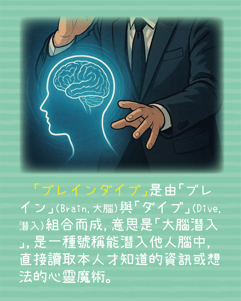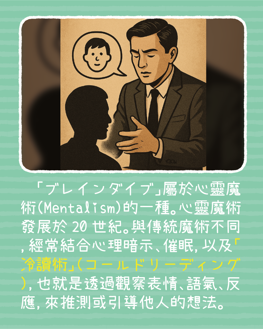 「ブレインダイブ」其實就是一種「心靈魔術」。心靈魔術發展於20世紀,算是魔術界比較後期的表演項目。與傳統魔術不同,它常結合心理暗示、催眠的元素。其中最關鍵的技術就是「冷讀術」(コールドリーディング),也就是透過觀察表情、語氣、反應,來推測或引導他們的想法,進而營造出有讀心超能力的效果。