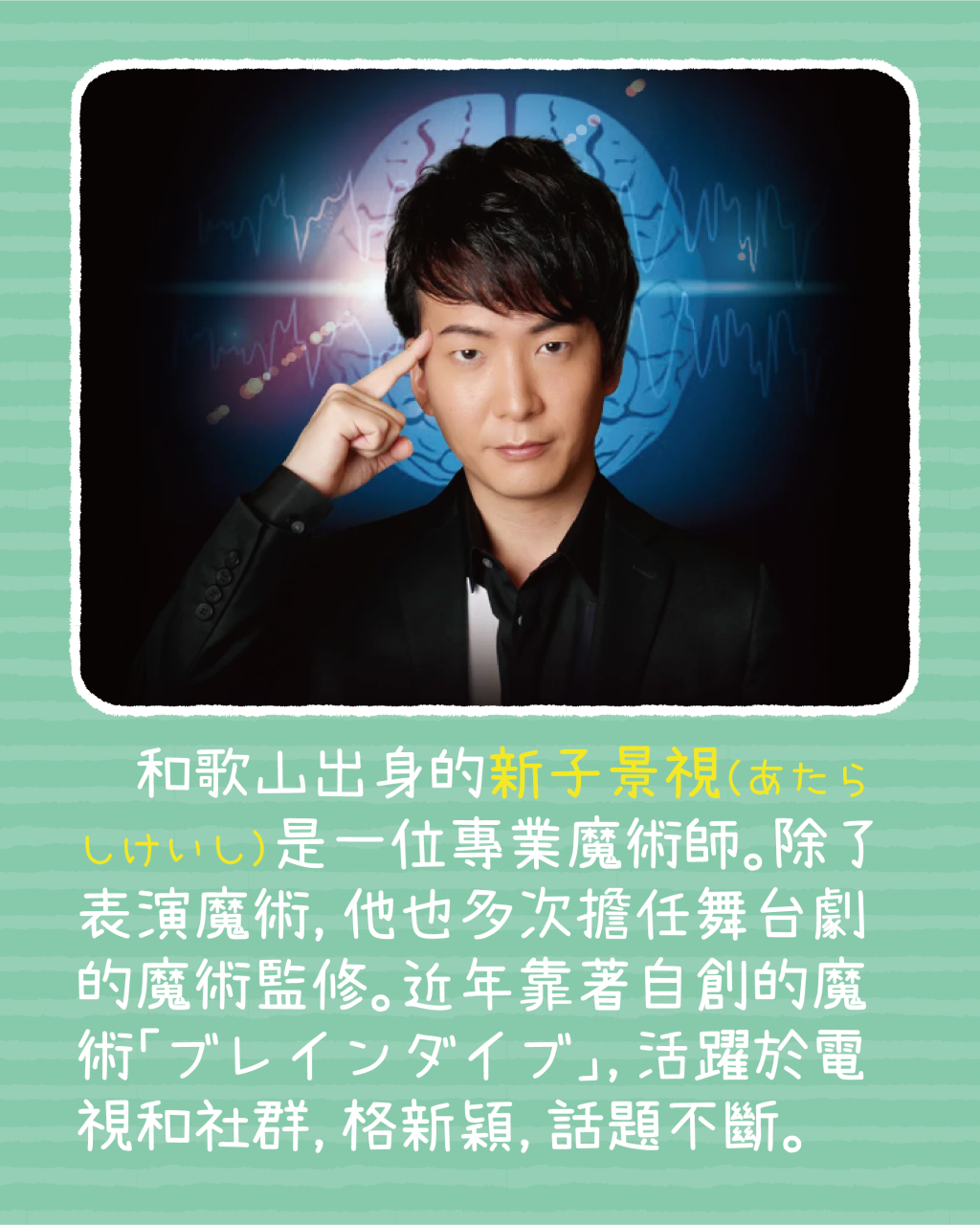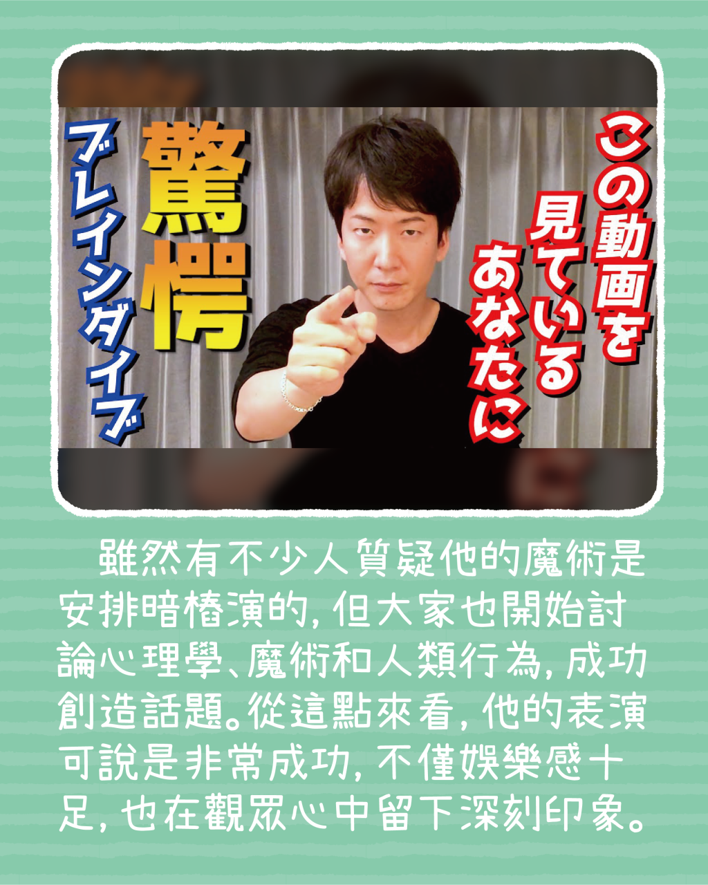 最近小編在追的幾個YOUTUBE頻道,都不約而同地邀請「新子景視」這位魔術師來表演他自創的魔術「ブレインダイブ」(大腦潛入),看得我是嘖嘖稱奇,忍不住想分享給大家。所以今天就讓我們來看看這魔術、認識這位魔術師吧!