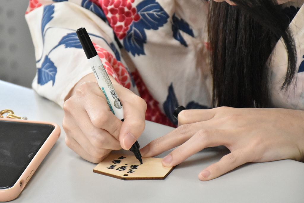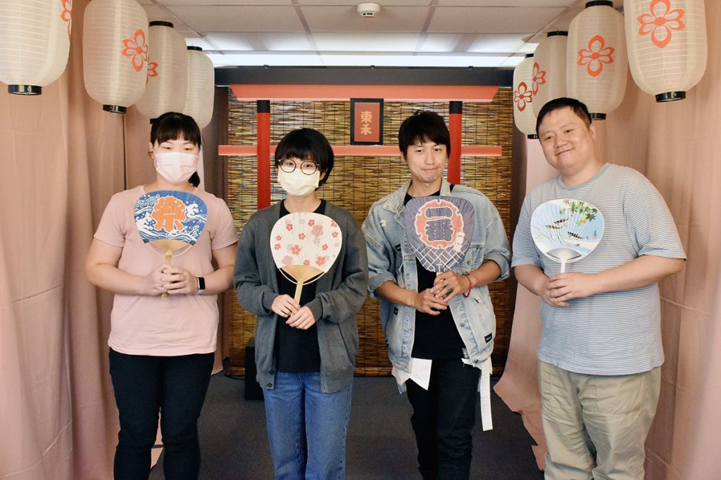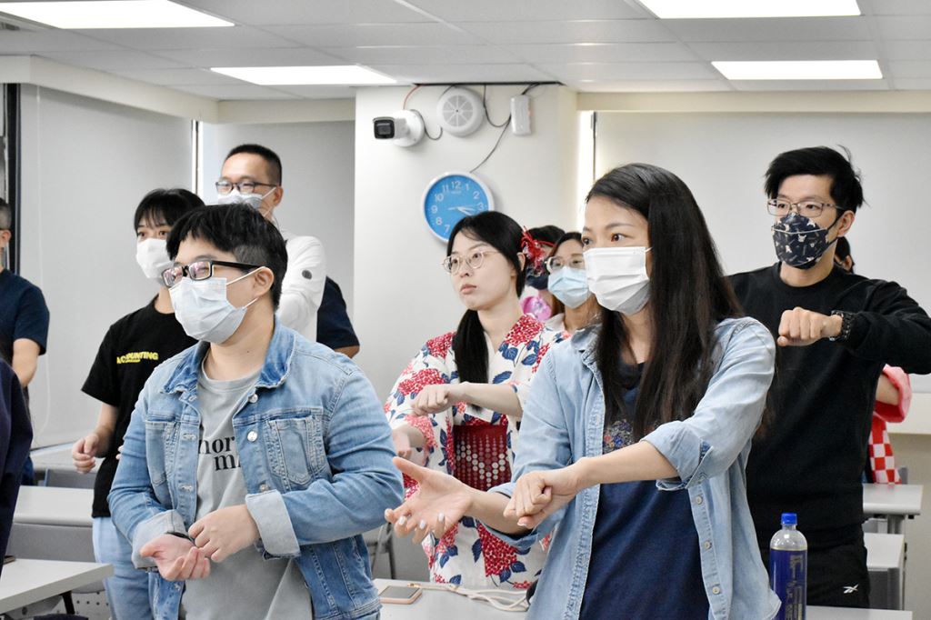 講座最後,老師也教大家如何正確地在神社的手水舍洗手,也借用東禾現場的鳥居裝飾,實際帶大家演練神社參拜-「二禮二拍手一禮」。參加講座的蔡同學表示,京都的參拜文化令他印象深刻,也很慶幸有來學正確參拜方式,非常實用。