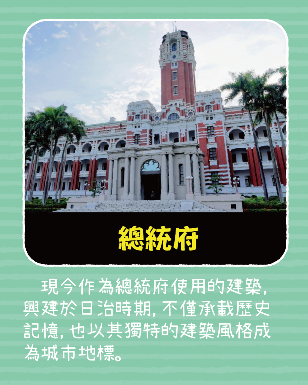 現今作為總統府使用的建築,興建於日治時期,不僅承載歷史記憶,也以其獨特的建築風格成為城市地標。