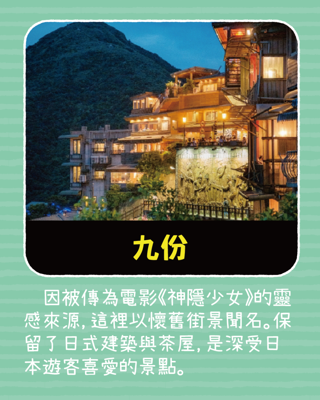 台灣至今仍保留許多日治時期的建築與景點,如台北的總統府(舊台灣總督府)、北投溫泉博物館(舊北投溫泉浴場)、新竹車站等。此外,九份因被傳為電影《神隱少女》的取景靈感地,也成為日本旅客喜愛的觀光景點。今天一起來盤點台灣人氣的日式建築和景點吧!