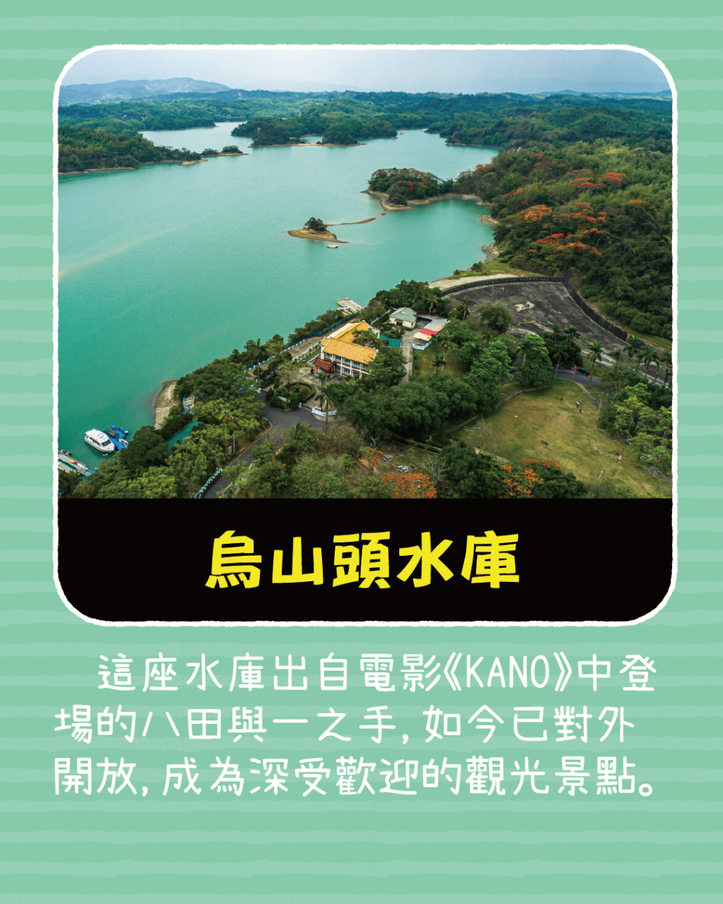 這座水庫出自電影《KANO》中登場的八田與一之手,如今已對外開放,成為深受歡迎的觀光景點。