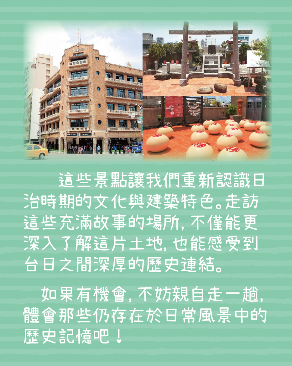 這些景點讓我們重新認識日治時期的文化與建築特色。走訪這些充滿故事的場所,不僅能更深入了解這片土地,也能感受到台日之間深厚的歷史連結。