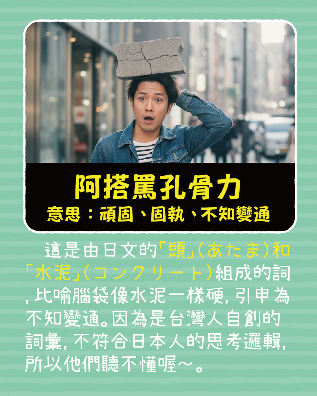 這是由日文的「頭」(あたま)和「水泥」(コンクリート)組成的詞,比喻腦袋像水泥一樣硬,引申為不知變通。因為是台灣人自創的詞彙,不符合日本人的思考邏輯,所以他們聽不懂喔~。