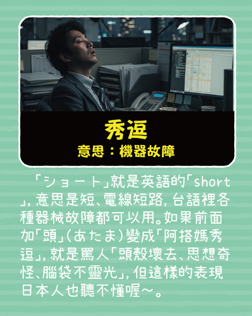 「ショート」就是英語的「short」,意思是短、電線短路,台語裡各種器械故障都可以用。如果前面加「頭」(あたま)變成「阿搭媽秀逗」,就是罵人「頭殼壞去、思想奇怪、腦袋不靈光」,但這樣的表現日本人也聽不懂喔~。