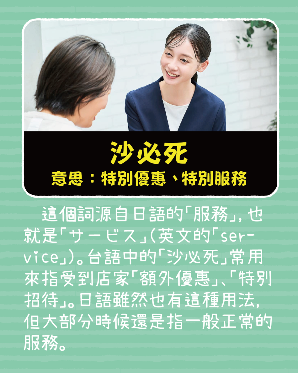 這個詞源自日語的「サービス」,更源頭是英文的「service」,也就是「服務」。台語中的「沙必死」常用來指受到店家「額外優惠」、「特別招待」;ACG圈也用這個詞代指「福利」。日語雖然也有這種用法,但大部分時候還是指一般正常的服務。