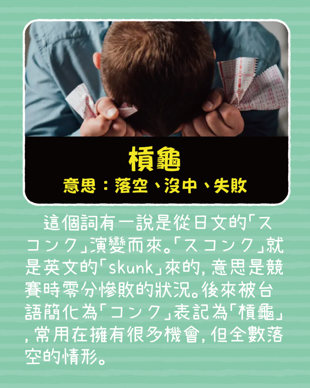後來被台語借用,並簡化為「コンク」,被表記為「槓龜」,常用在抽獎、樂透,特別是擁有很多機會,但全部落空的情形。