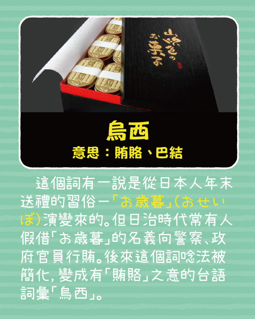 根據教育部線上字典所載,這個詞是從日語的「お世辞」(おせじ)、意思是「恭維話、客套話」簡化而來。 不過,許多鄉土作家、學者則認為這個詞是從「お歳暮」(おせいぼ)演變來的。日本人歲末年終會向這一年有受過關照的人送禮的習俗,那份禮物就叫「お歳暮」。 但日治時代常有人以送「お歳暮」的名義向警察、政府官員行賄。久而久之這個詞就有了「賄賂」的意思,並被簡化成「烏西」這個台語詞彙。